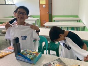 また日本のエージェントさんと、学校側からそれぞれジュニアキャンプ用のE-roomTシャツをもらい、子どもたちも喜んでいました。