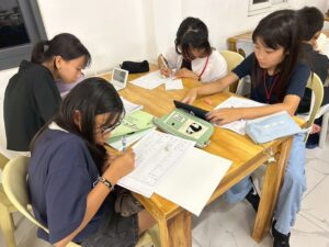 アクティビティ後は他の国からも来ているジュニアキャンプのみんなと一緒に自習の時間です。宿題をしたり単語を覚えたりみんな頑張っています。