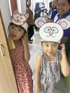 先生の用意した衣装やお面をつけて準備万端ですね。お面をつけた子どもたちとってもかわいかったです。