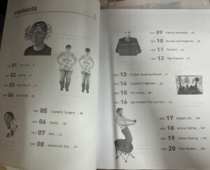 私が使っていたこの教科書はConversationの授業で使われたものです。各章ごとにトピックがあり、そのトピックに関する文章や質問が載っています。それを使いながら主に先生と意見を交換するような形式で授業が進められました。