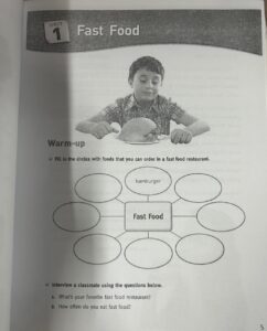最初のトピックは”ファストフード”についてでした。導入ではファストフードでは何を頼むかを書き込む欄があり、その後好きなファストフードのお店やどのくらいファストフードを食べるかを先生と話しました。