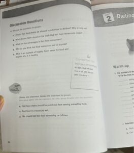 最後はそれぞれの質問に対してクラスでディスカッションを行う内容なのですが、1対1であるため、先生との意見の交換になります。「ファストフードは子どもへの広告を許されるべきか」「ファストフードの利点は何だと思うか」などさまざまな質問があります。