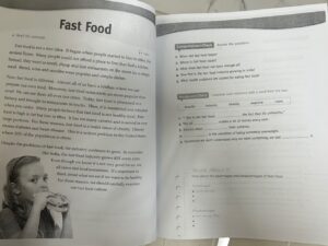 次のページに進むと、ファストフードに関する文章と、質問があります。最初の質問は文章の中で書かれていることに対しての質問ですが、記入をせずに口答で答えました。