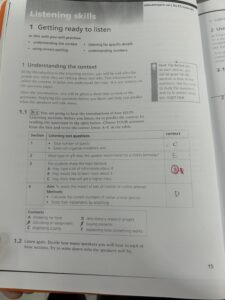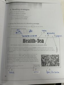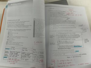 IELTSの学生はこのような教材を使いながら問題を解いて、ターゲットスコアを目指して勉強をしています。さらに先生はテキスト以外に実践問題を用意してくれているので、問題を繰り返し解いて試験問題に慣れることができます。また、IELTSの学生は2週間に1回模試があるので、自分のレベルを細かく確認することができます。