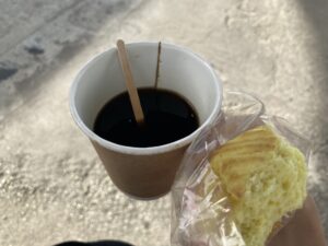 ↑ドライバースタッフがくれたお菓子とコーヒー(アリ入り)。私がいつもお腹すいたとわめくから恵んでくれた。